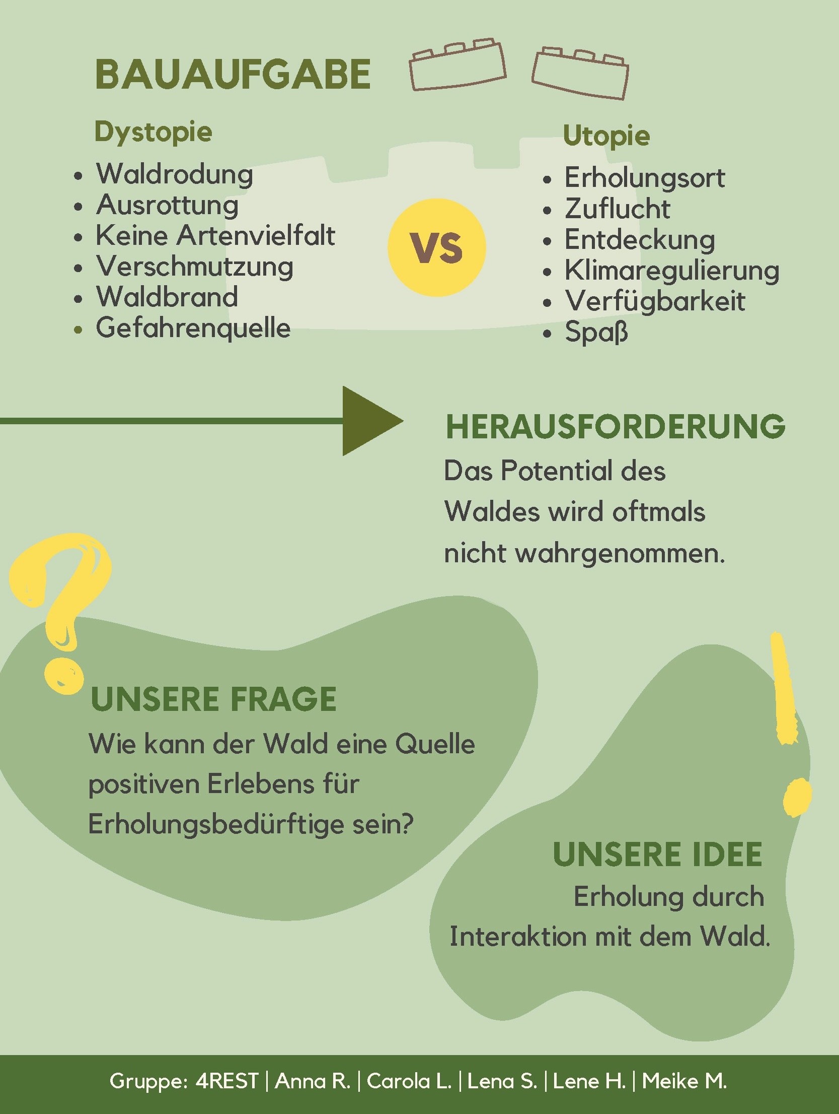 Die Aufgabe bestand darin, ein Konzept zu entwickeln, wie der Wald als Quelle positiven Erlebens genutzt werden kann. Der Fokus lag dabei nicht nur auf der Natur selbst, sondern insbesondere darauf, wie Menschen Zugang zum Wald finden und ihn bewusst als Rückzugsort wahrnehmen können.