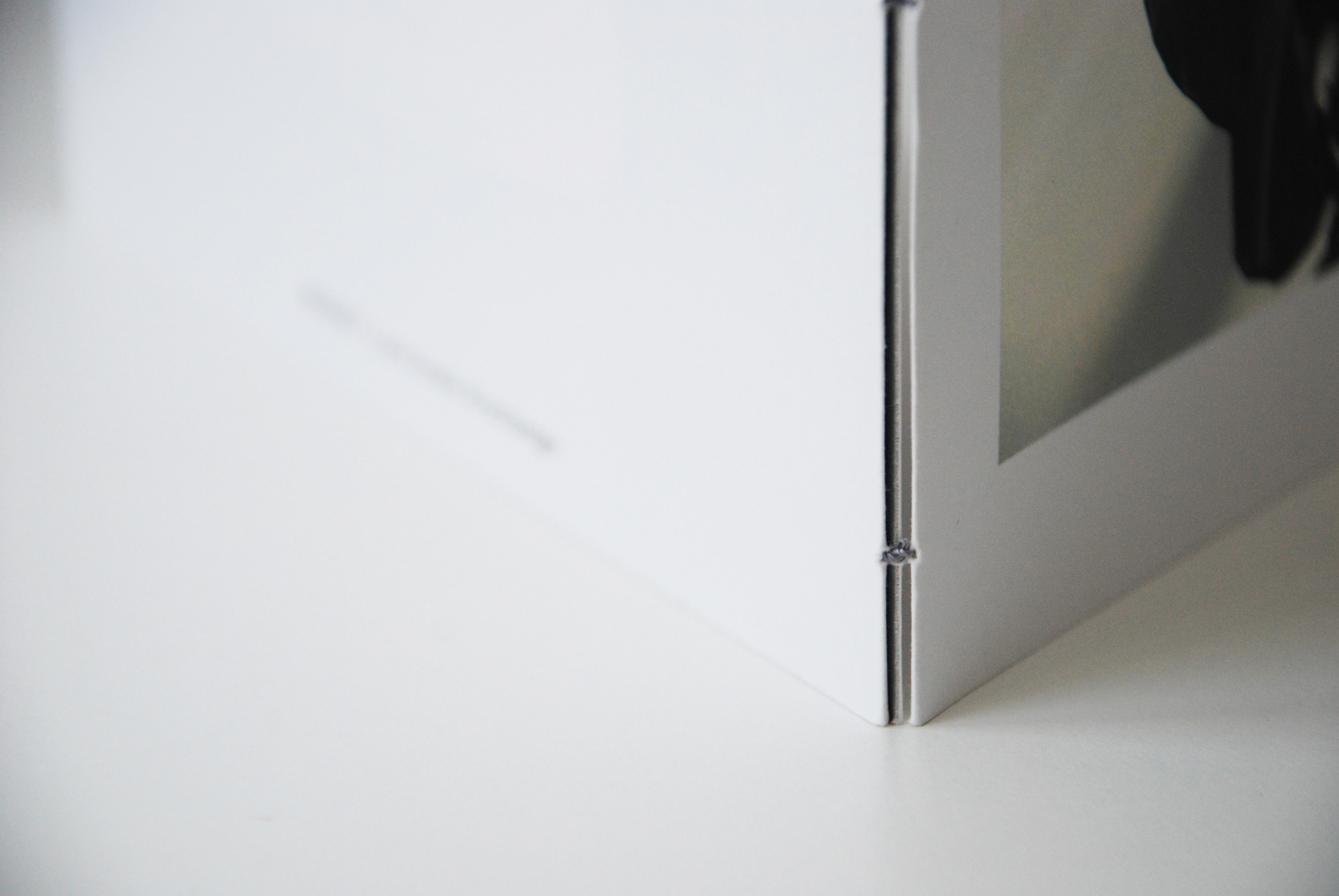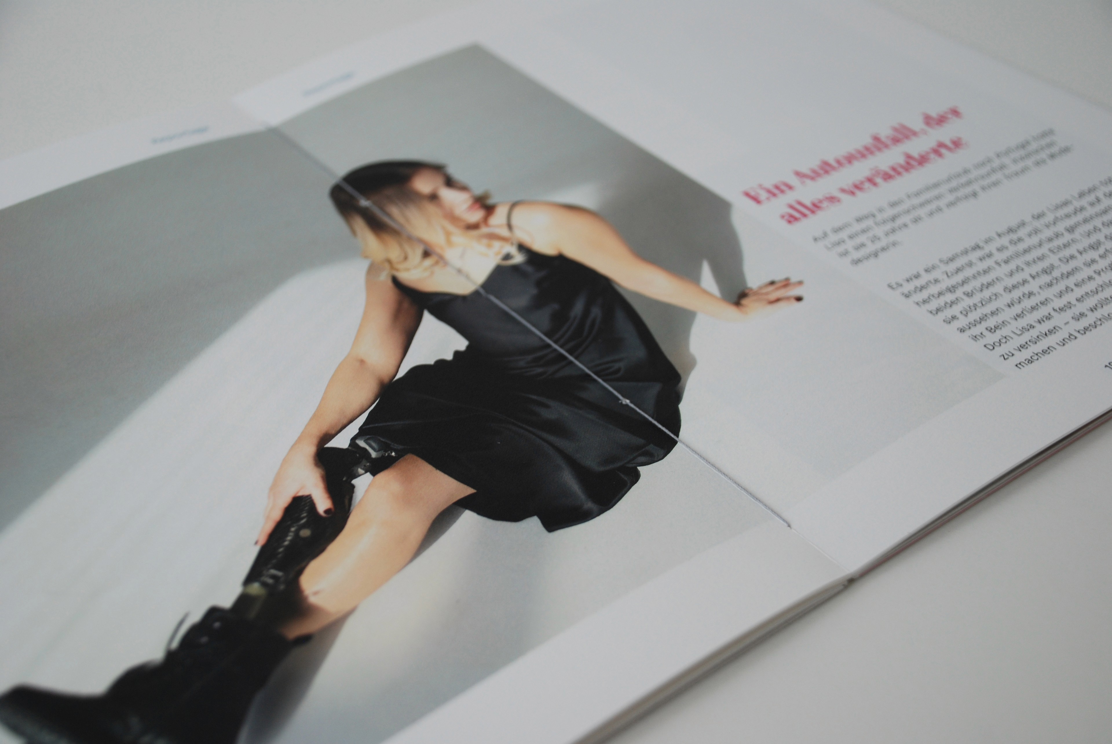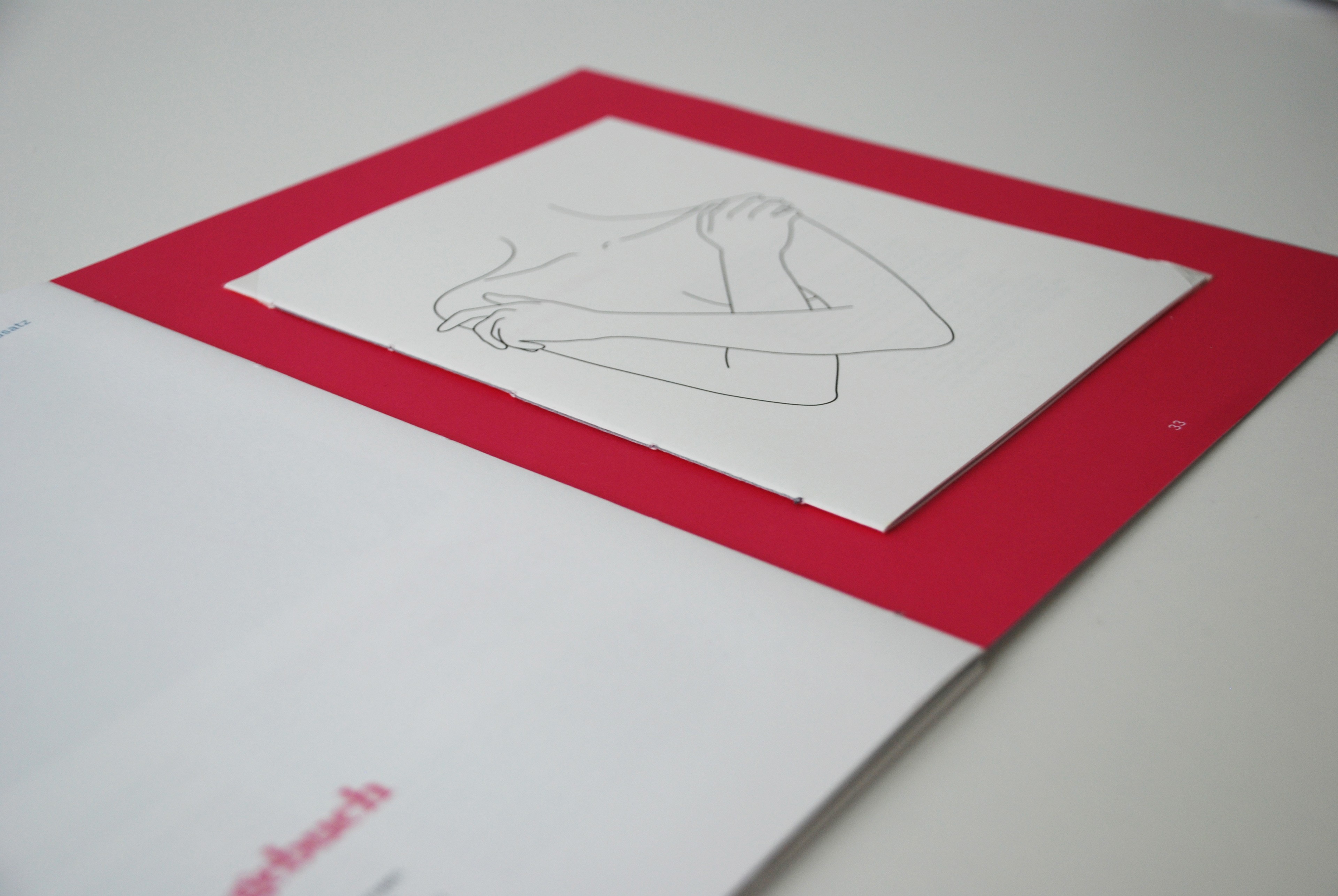 Das Magazin wurde mit einer offenen Kettenstichheftung gebunden. Der graue Faden greift das Thema visuell auf. Das zusätzliche Heftchen wurde mit einer einfachen Fadenheftung versehen und mittels Fotoecken im Magazin befestigt.
